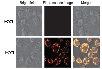 與HOCl反應(yīng)產(chǎn)生強(qiáng)烈熒光。專一性高,背景低;用于生物樣品中HOCl含量的測量與熒光成像;用于Myeloperoxidase (neutrophils) 的活性研究.