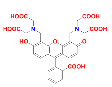 鈣黃綠素,也稱為熒光素,熒光素復(fù)合物,是一種熒光鈣指示劑,其激發(fā)和發(fā)射波長分別為495和515nm。鈣黃綠素在100 mM以上的濃度下會(huì)自動(dòng)猝滅。它用作EDTA滴定鈣離子和熒光測定鈣的絡(luò)合指示劑,微溶于水。質(zhì)子解離常數(shù)為pKa1的= 2.1,pKa2 = 2.9,pKa3 = 4.2,pKa4 = 5.5,pKa5 = 10.8和pKa6 = 11.7。鈣黃綠素溶液在酸性條件下發(fā)出黃綠色熒光,而在堿性條件下不發(fā)出熒光。但是,鈣黃綠素在堿性條件下在金屬離子(例如Al,Ba,Cu,Mg和Zn)存在下發(fā)出熒光。因此,鈣黃綠素還可以用于除Ca之外的這些重金屬離子的直接熒光滴定。
